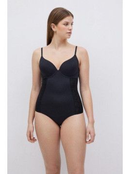 Gracias a su media compresión, ayuda a alisar la zona del abdomen y definir la silueta, mientras que su estructura con aro y relleno proporciona un escote natural y bien sujeto. El cierre trasero facilita la colocación y mejora el ajuste.