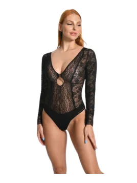 Fabricado con un encaje floral de alta calidad, el **body encaje negro** se ajusta perfectamente al cuerpo, combinando comodidad y un diseño espectacular. La manga larga aporta un contraste elegante al atrevido escote profundo, creando una silueta dramática y muy femenina.